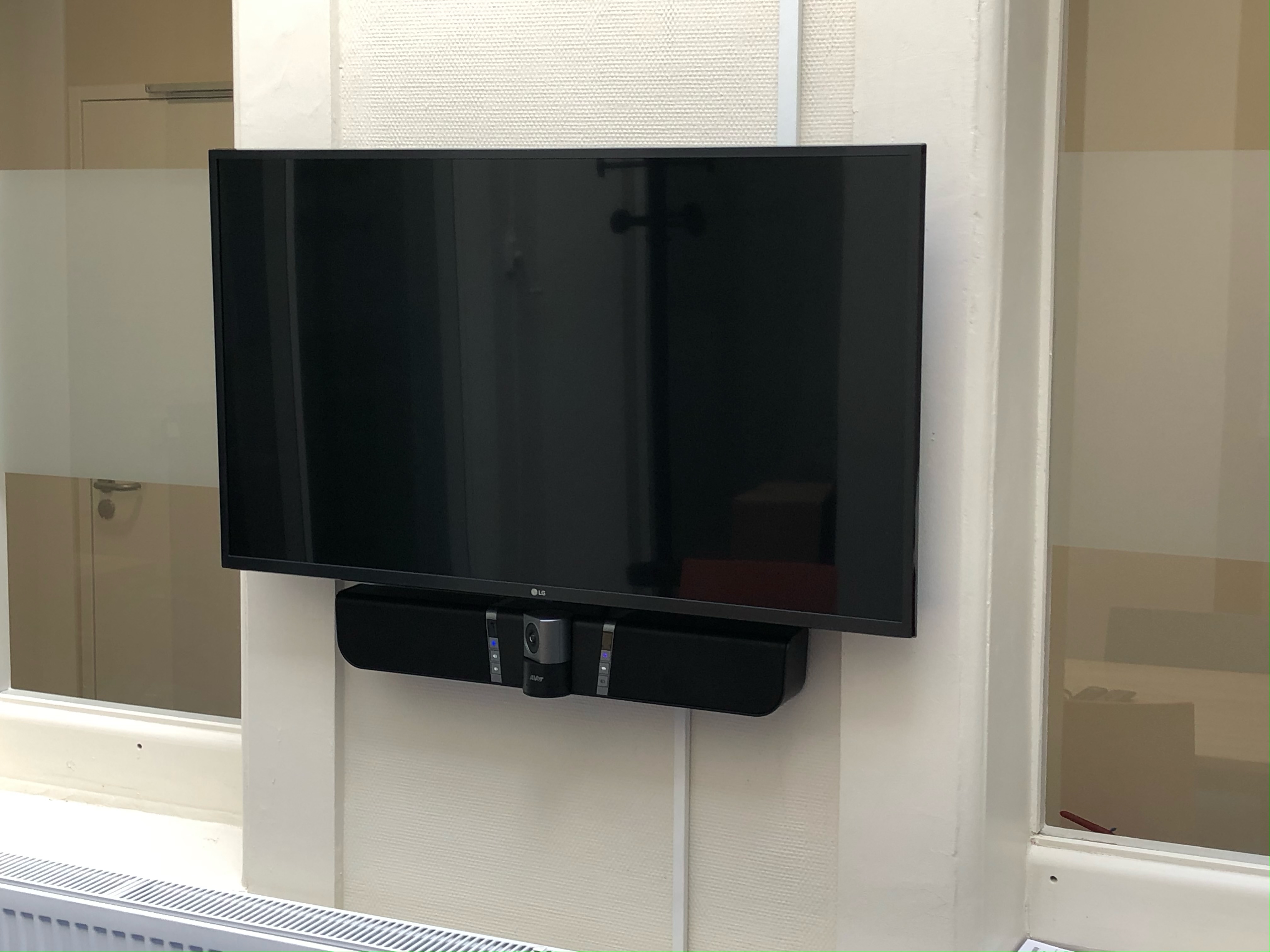Salle de visioconférence equiper d'un ecran et d'un systemes de visio dans une barre en dessous de l'ecran.